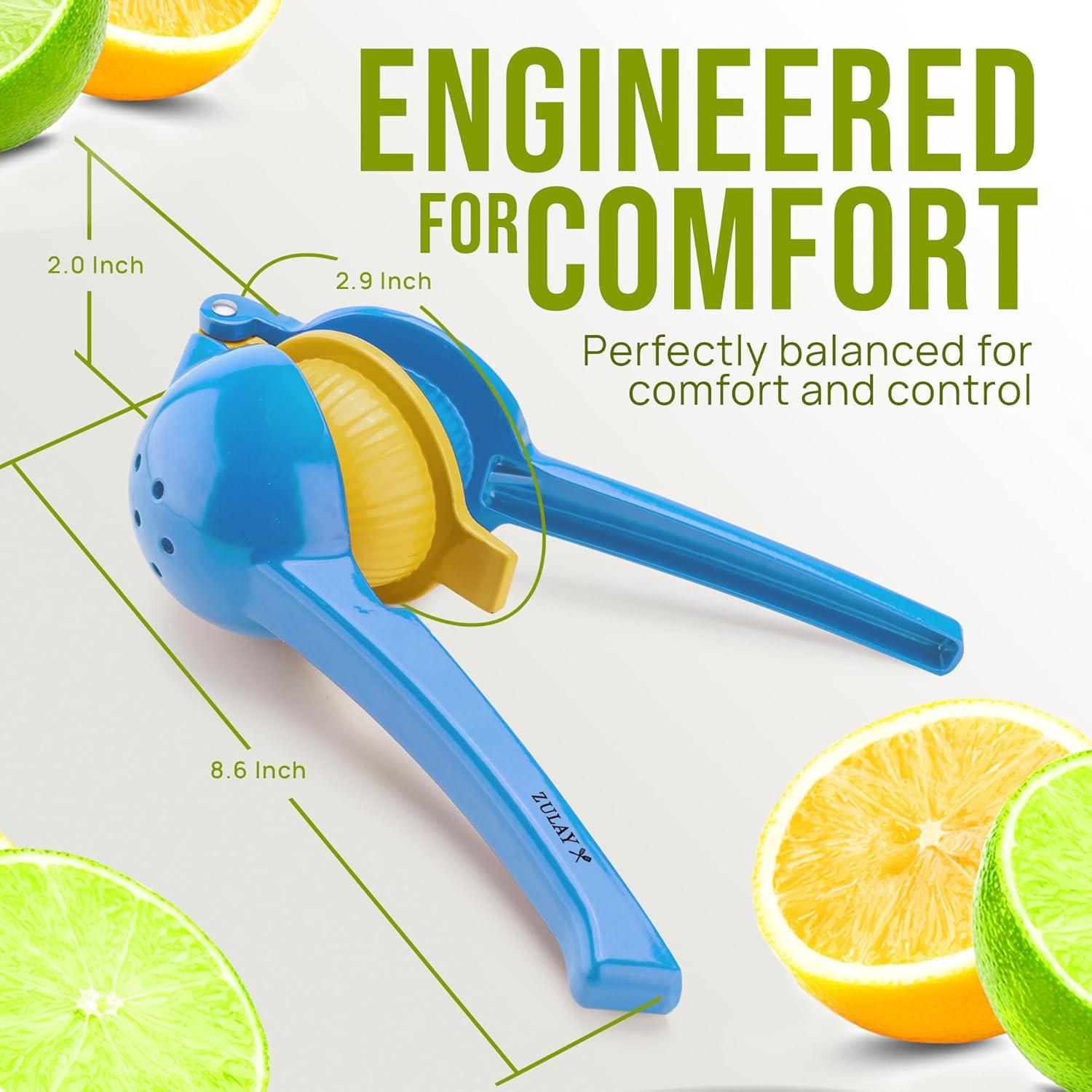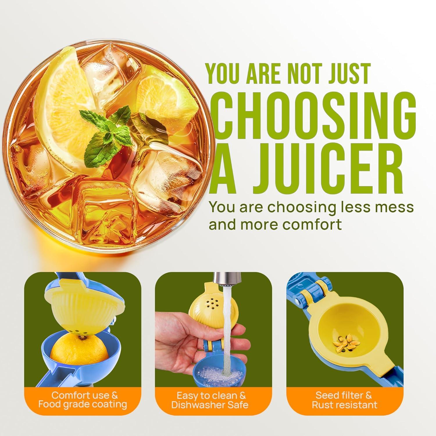 SAVE TIME AND EFFORT: Our citrus juicer makes juicing easy-peasy lemon squeezy. The comfortable grip handle allows you to squeeze all the juice from lemons limes or oranges in seconds for making delicious recipes like guacamole lemonade cocktails and more. Unlike bulky electric juicers you no longer have to worry about electricity or replacing batteries with this manual citrus press