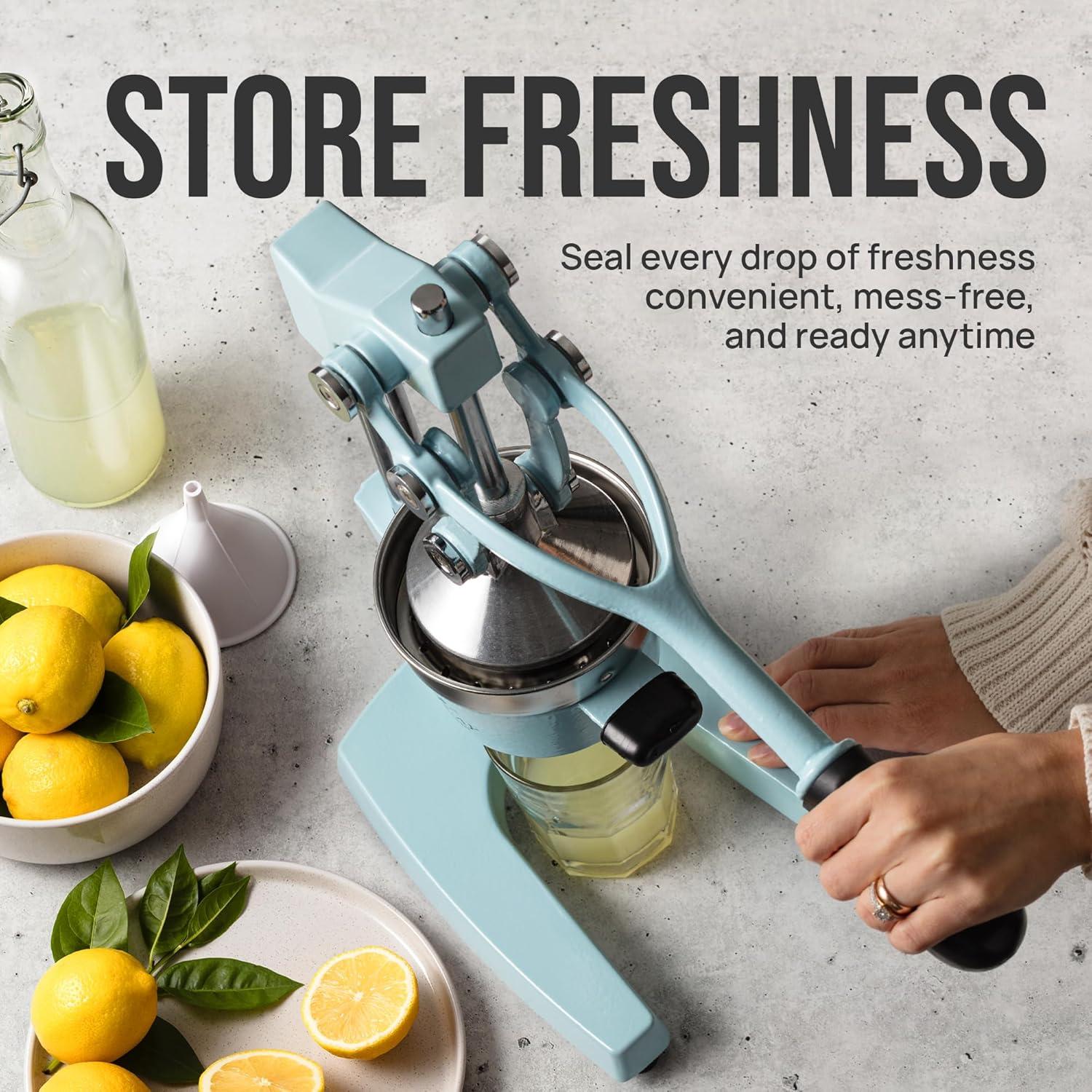 SAVE TIME AND EFFORT: Our citrus juicer makes juicing easy-peasy lemon squeezy. The comfortable grip handle allows you to squeeze all the juice from lemons limes or oranges in seconds for making delicious recipes like guacamole lemonade cocktails and more. Unlike bulky electric juicers you no longer have to worry about electricity or replacing batteries with this manual citrus press