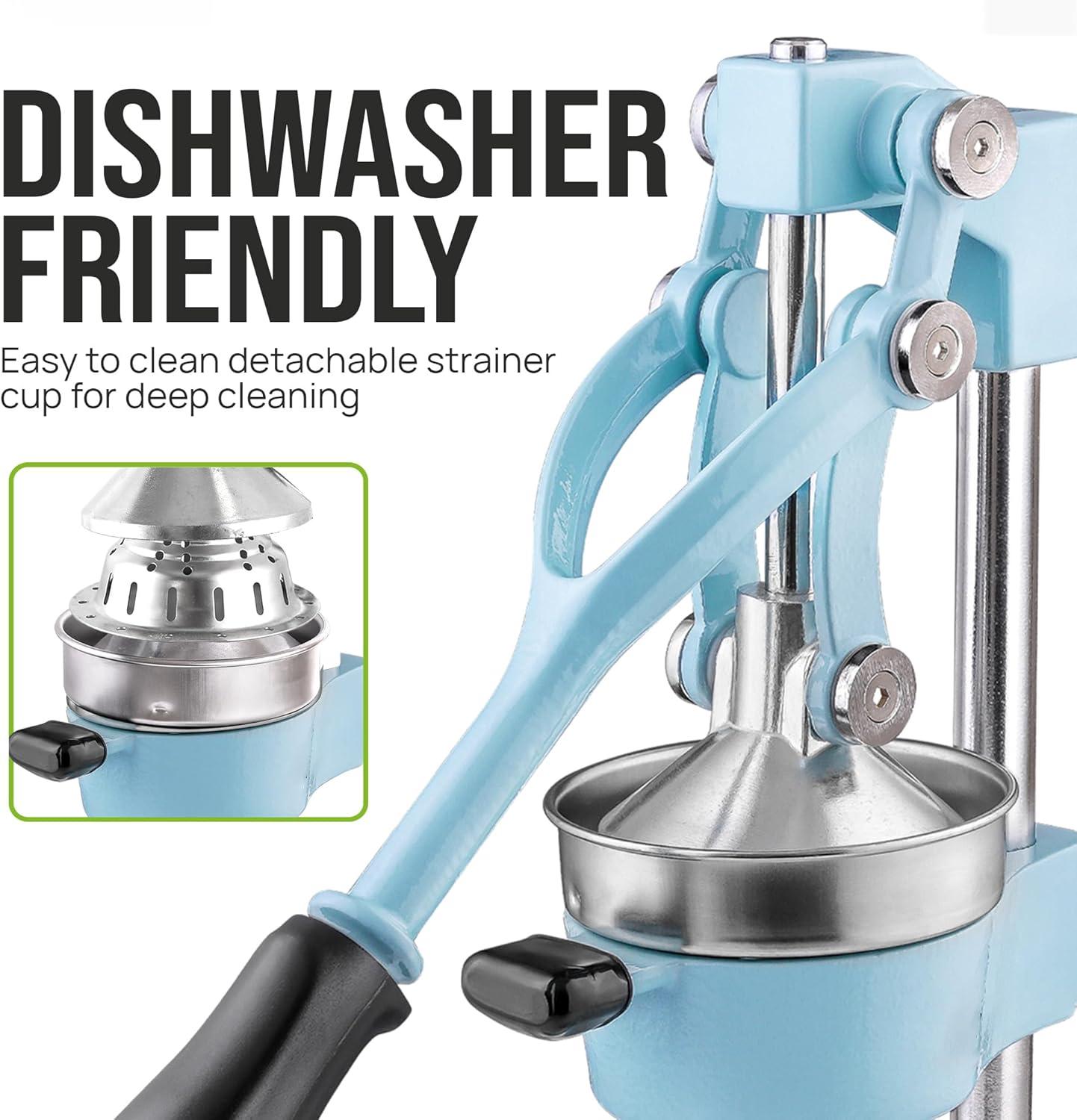 STURDY AND DURABLE MATERIAL: This manual juicer is made of heavy-duty cast iron that can easily withstand the pressure from continuous pressing for years to come. The leverage mechanism allows a one-time easy pull to get all the juice out. Our citrus press is designed with a heavy rubberized base to firmly keep it in place without the fear of falling tipping or sliding off the counter. This hand juicer is great for both professional and at-home use
