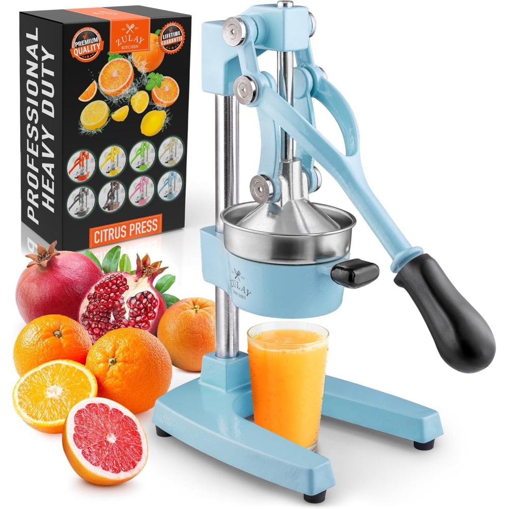 About this item SQUEEZE OUT EVERY DROP OF JUICE:Our lemon squeezer won’t waste even a single drop from your favorite fruit and will also leave the seeds and pulp behind! The 5-inch diameter of the citrus press bowl makes it suitable for various types and sizes of fruit. Watch the juicy goodness of limes, lemons, oranges, grapefruit, apples, pineapples, pomegranates, and other citrus fruits come straight out of the citrus squeezer, ready to add flavor to your meals or drinks. SAVE TIME AND EFFORT:Our citrus juicer makes juicing easy-peasy lemon squeezy. The comfortable grip handle allows you to squeeze all the juice from lemons, limes, or oranges in seconds for making delicious recipes like guacamole, lemonade, cocktails, and more. Unlike bulky electric juicers, you no longer have to worry about electricity or replacing batteries with this manual citrus press. STURDY AND DURABLE MATERIAL:This manual juicer is made of heavy-duty cast iron that can easily withstand the pressure from continuous pressing for years to come. The leverage mechanism allows a one-time easy pull to get all the juice out. Our citrus press is designed with a heavy rubberized base to firmly keep it in place without the fear of falling, tipping, or sliding off the counter. This hand juicer is great for both professional and at-home use. EASY TO CLEAN AND SAFE TO USE:Focus more on extracting fresh fruit juice than worrying about cleaning up. All parts of this juice press are detachable and dishwasher friendly, which makes cleaning super quick. The stainless steel bowl and filter cone are made using material, making the fruit squeezer safe and healthy to use. HASSLE-FREE, ZULAY GUARANTEE:We love and take our pomegranate juicer and back it up with a lifetime guarantee. Have the confidence that this product will last. If there are ever any issues, just contact us and we will make it right.
