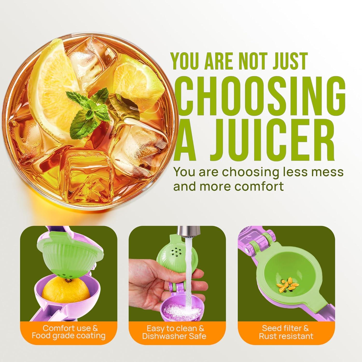 SAVE TIME AND EFFORT: Our citrus juicer makes juicing easy-peasy lemon squeezy. The comfortable grip handle allows you to squeeze all the juice from lemons limes or oranges in seconds for making delicious recipes like guacamole lemonade cocktails and more. Unlike bulky electric juicers you no longer have to worry about electricity or replacing batteries with this manual citrus press