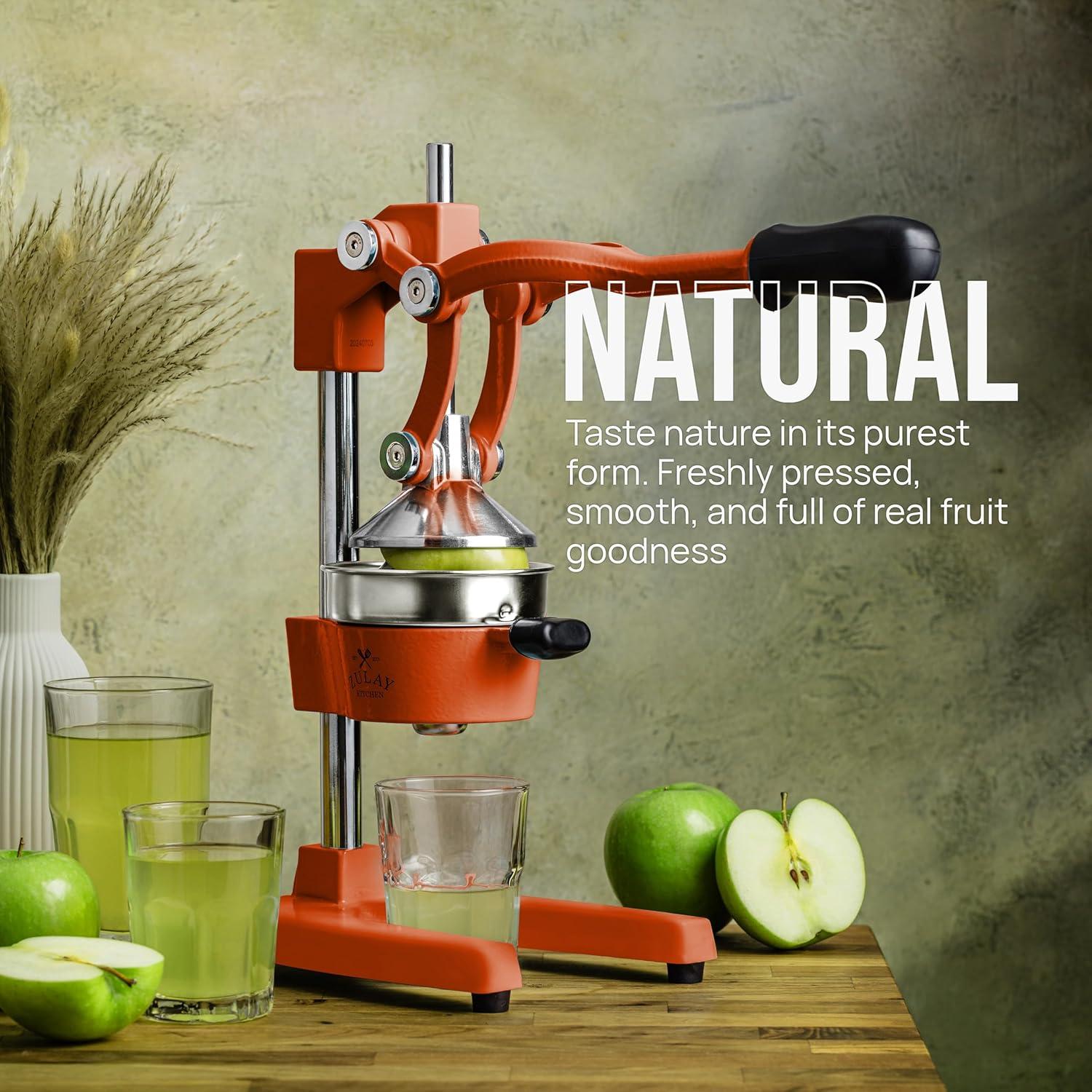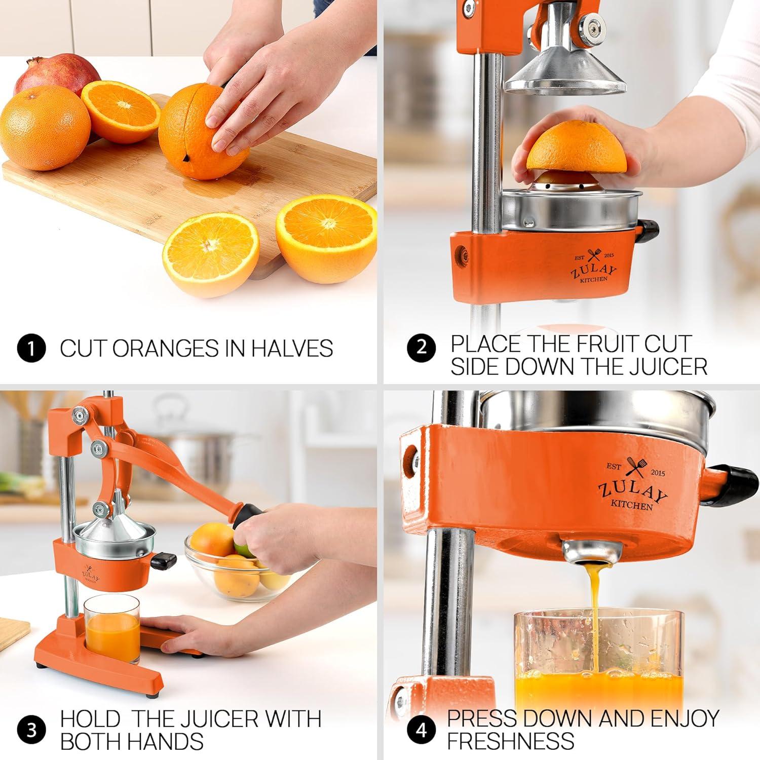 About this item SQUEEZE OUT EVERY DROP OF JUICE:Our lemon squeezer won’t waste even a single drop from your favorite fruit and will also leave the seeds and pulp behind! The 5-inch diameter of the citrus press bowl makes it suitable for various types and sizes of fruit. Watch the juicy goodness of limes, lemons, oranges, grapefruit, apples, pineapples, pomegranates, and other citrus fruits come straight out of the citrus squeezer, ready to add flavor to your meals or drinks. SAVE TIME AND EFFORT:Our citrus juicer makes juicing easy-peasy lemon squeezy. The comfortable grip handle allows you to squeeze all the juice from lemons, limes, or oranges in seconds for making delicious recipes like guacamole, lemonade, cocktails, and more. Unlike bulky electric juicers, you no longer have to worry about electricity or replacing batteries with this manual citrus press. STURDY AND DURABLE MATERIAL:This manual juicer is made of heavy-duty cast iron that can easily withstand the pressure from continuous pressing for years to come. The leverage mechanism allows a one-time easy pull to get all the juice out. Our citrus press is designed with a heavy rubberized base to firmly keep it in place without the fear of falling, tipping, or sliding off the counter. This hand juicer is great for both professional and at-home use. EASY TO CLEAN AND SAFE TO USE:Focus more on extracting fresh fruit juice than worrying about cleaning up. All parts of this juice press are detachable and dishwasher friendly, which makes cleaning super quick. The stainless steel bowl and filter cone are made using material, making the fruit squeezer safe and healthy to use. HASSLE-FREE, ZULAY GUARANTEE:We love and take our pomegranate juicer and back it up with a lifetime guarantee. Have the confidence that this product will last. If there are ever any issues, just contact us and we will make it right.