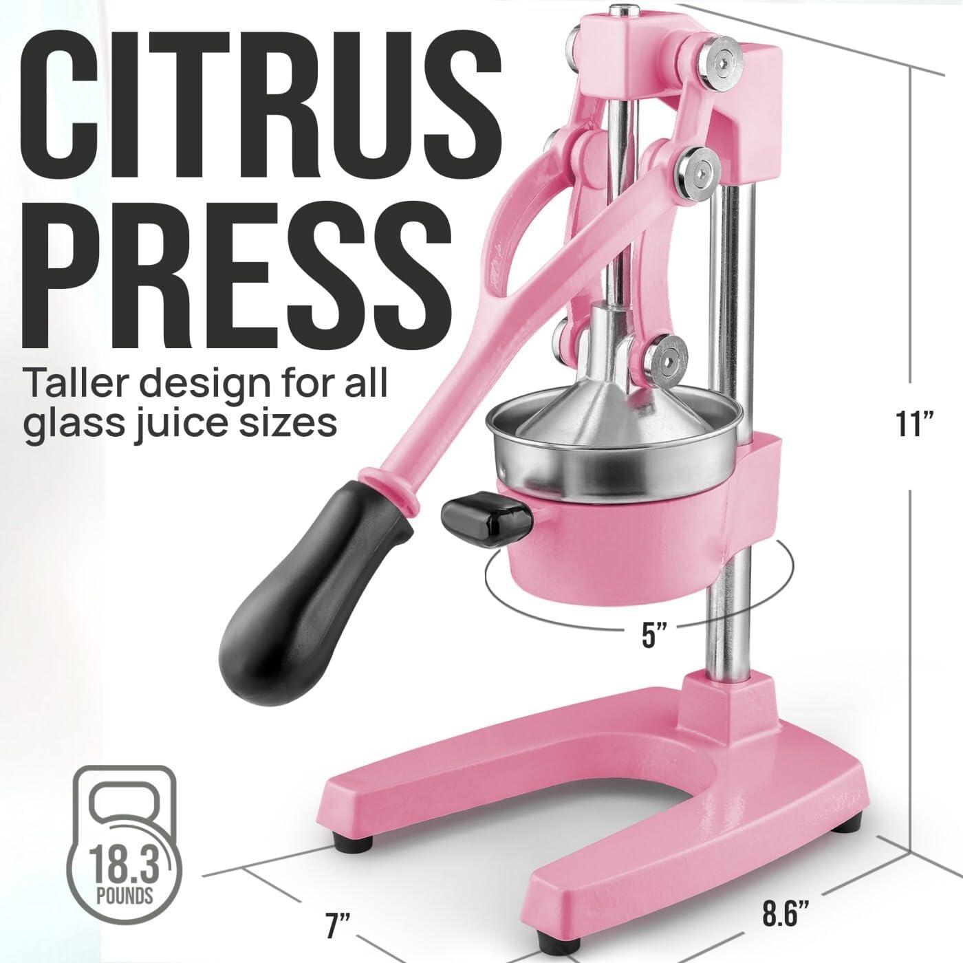 Zulay Kitchen 9 in 1 Cast Iron Juicer – Easy-to-Clean Heavy-Duty Manual Juicer with Presser Attachment to Juice All Types of Fruits! Extra Tall with Stainless Steel Bowl – Black(Pink)