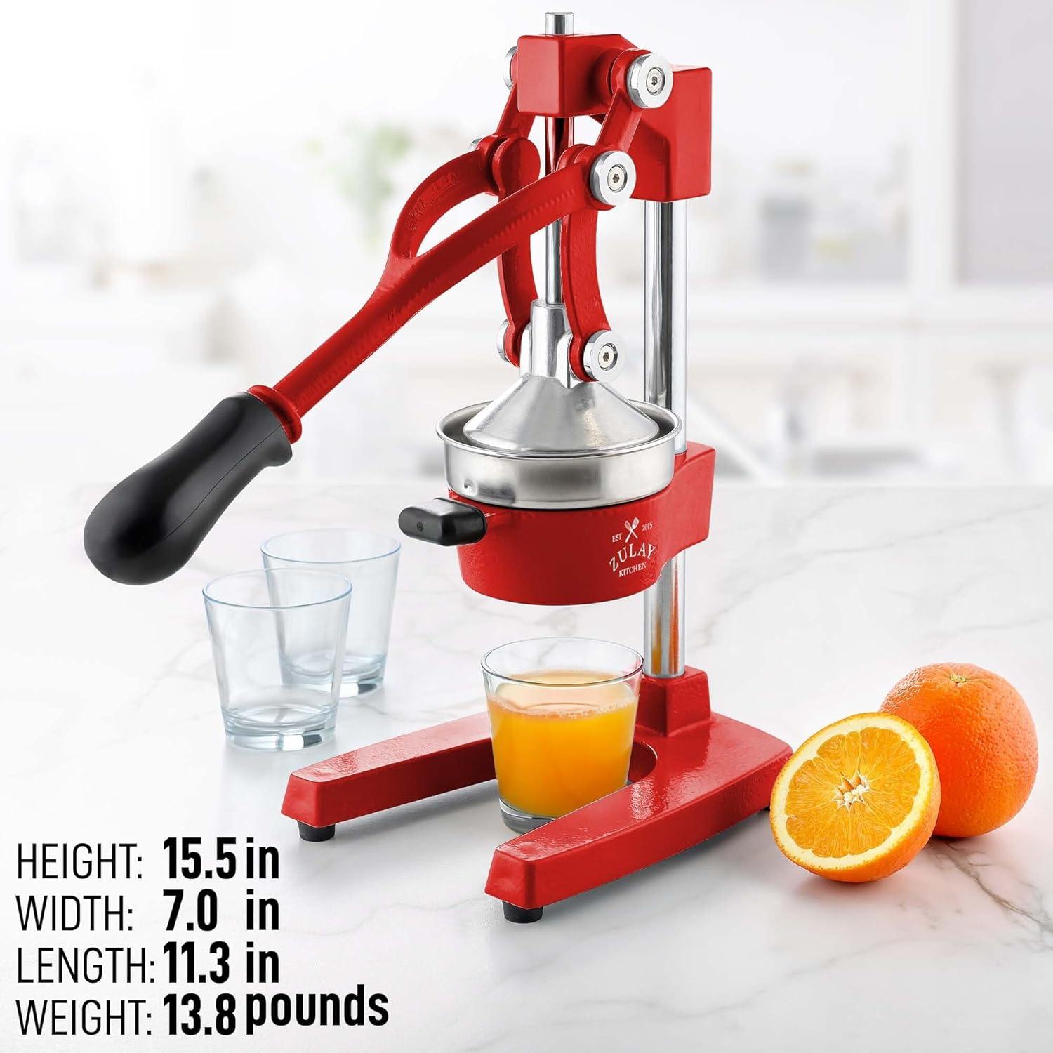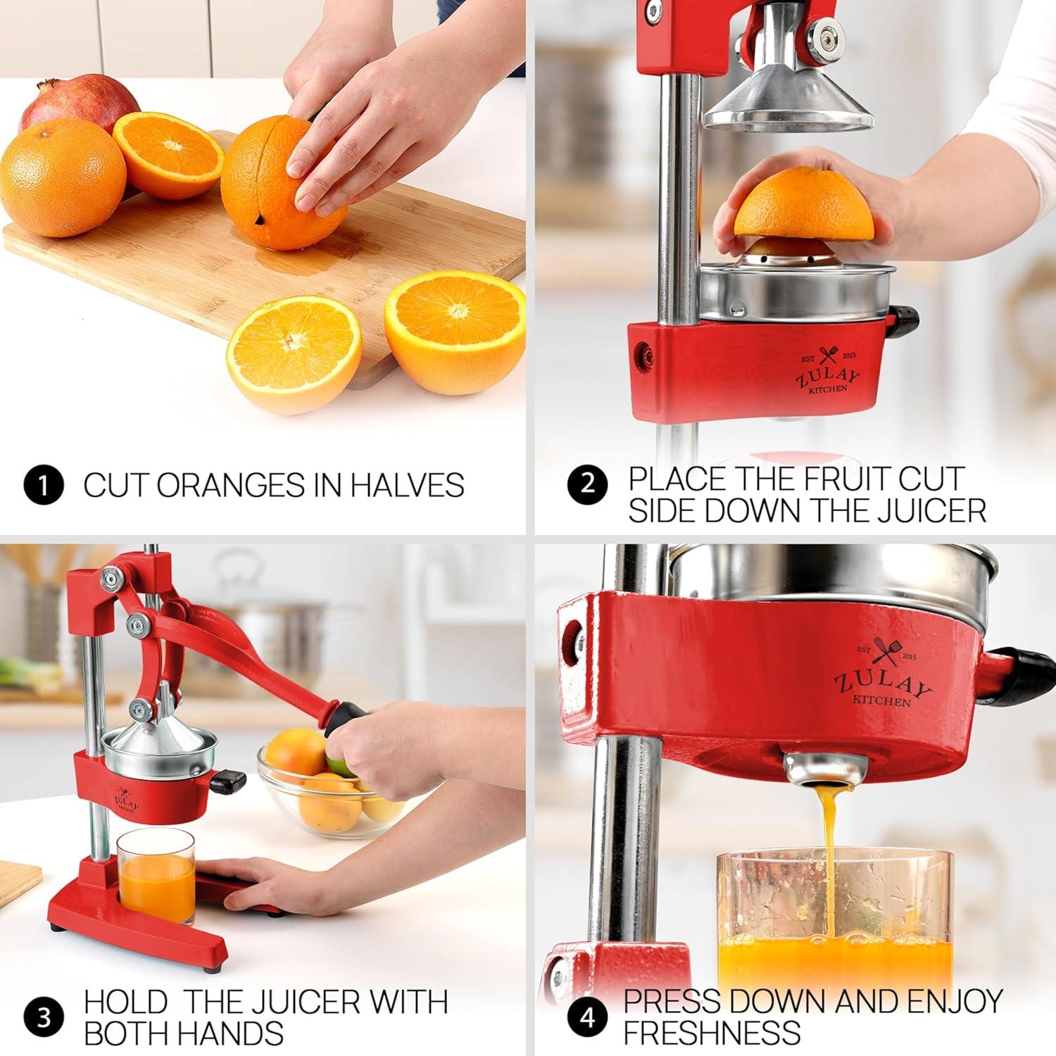 About this item SQUEEZE OUT EVERY DROP OF JUICE:Our lemon squeezer won’t waste even a single drop from your favorite fruit and will also leave the seeds and pulp behind! The 5-inch diameter of the citrus press bowl makes it suitable for various types and sizes of fruit. Watch the juicy goodness of limes, lemons, oranges, grapefruit, apples, pineapples, pomegranates, and other citrus fruits come straight out of the citrus squeezer, ready to add flavor to your meals or drinks. SAVE TIME AND EFFORT:Our citrus juicer makes juicing easy-peasy lemon squeezy. The comfortable grip handle allows you to squeeze all the juice from lemons, limes, or oranges in seconds for making delicious recipes like guacamole, lemonade, cocktails, and more. Unlike bulky electric juicers, you no longer have to worry about electricity or replacing batteries with this manual citrus press. STURDY AND DURABLE MATERIAL:This manual juicer is made of heavy-duty cast iron that can easily withstand the pressure from continuous pressing for years to come. The leverage mechanism allows a one-time easy pull to get all the juice out. Our citrus press is designed with a heavy rubberized base to firmly keep it in place without the fear of falling, tipping, or sliding off the counter. This hand juicer is great for both professional and at-home use. EASY TO CLEAN AND SAFE TO USE:Focus more on extracting fresh fruit juice than worrying about cleaning up. All parts of this juice press are detachable and dishwasher friendly, which makes cleaning super quick. The stainless steel bowl and filter cone are made using material, making the fruit squeezer safe and healthy to use. HASSLE-FREE, ZULAY GUARANTEE:We love and take our pomegranate juicer and back it up with a lifetime guarantee. Have the confidence that this product will last. If there are ever any issues, just contact us and we will make it right.