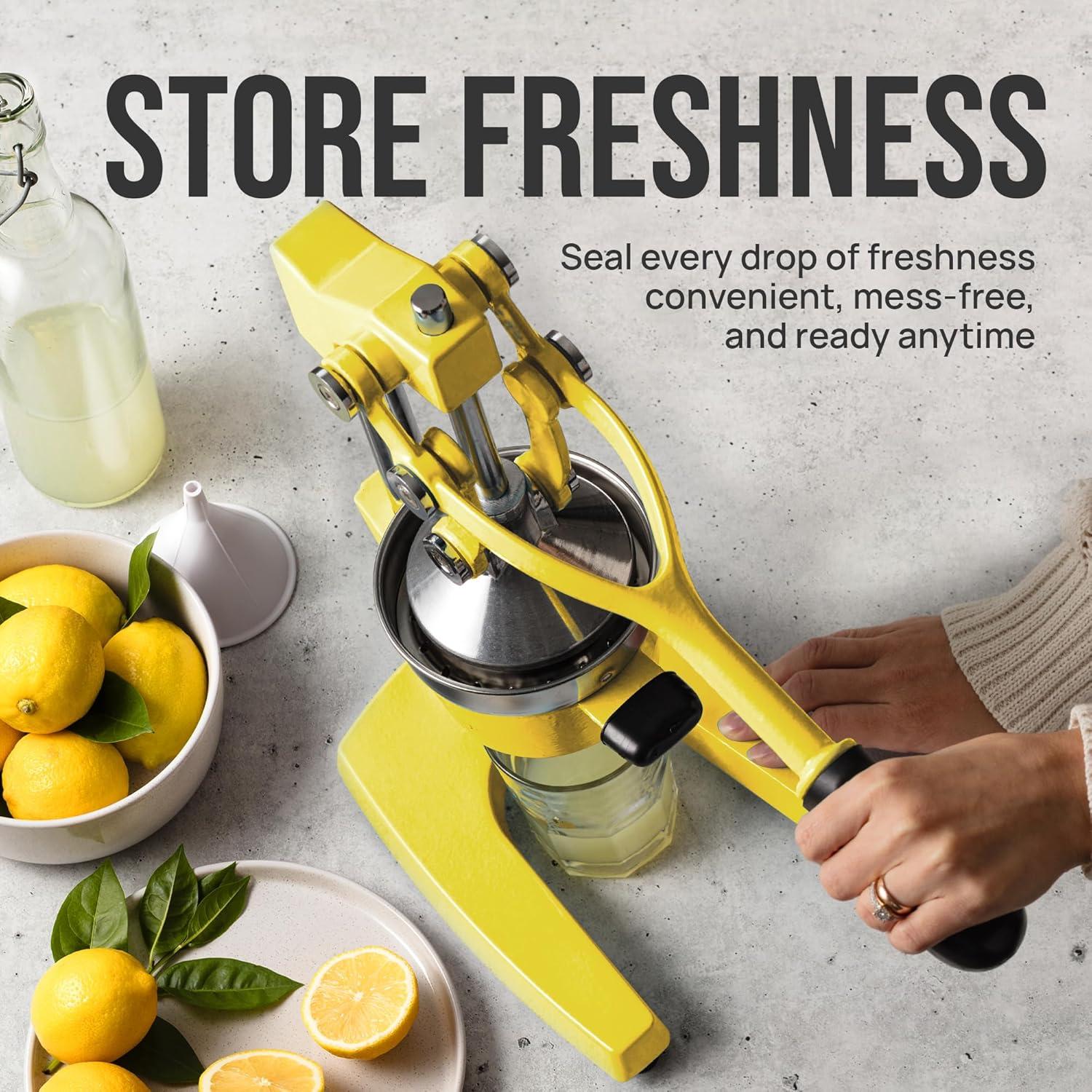 SAVE TIME AND EFFORT: Our citrus juicer makes juicing easy-peasy lemon squeezy. The comfortable grip handle allows you to squeeze all the juice from lemons limes or oranges in seconds for making delicious recipes like guacamole lemonade cocktails and more. Unlike bulky electric juicers you no longer have to worry about electricity or replacing batteries with this manual citrus press