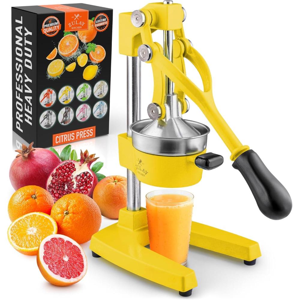 About this item SQUEEZE OUT EVERY DROP OF JUICE:Our lemon squeezer won’t waste even a single drop from your favorite fruit and will also leave the seeds and pulp behind! The 5-inch diameter of the citrus press bowl makes it suitable for various types and sizes of fruit. Watch the juicy goodness of limes, lemons, oranges, grapefruit, apples, pineapples, pomegranates, and other citrus fruits come straight out of the citrus squeezer, ready to add flavor to your meals or drinks. SAVE TIME AND EFFORT:Our citrus juicer makes juicing easy-peasy lemon squeezy. The comfortable grip handle allows you to squeeze all the juice from lemons, limes, or oranges in seconds for making delicious recipes like guacamole, lemonade, cocktails, and more. Unlike bulky electric juicers, you no longer have to worry about electricity or replacing batteries with this manual citrus press. STURDY AND DURABLE MATERIAL:This manual juicer is made of heavy-duty cast iron that can easily withstand the pressure from continuous pressing for years to come. The leverage mechanism allows a one-time easy pull to get all the juice out. Our citrus press is designed with a heavy rubberized base to firmly keep it in place without the fear of falling, tipping, or sliding off the counter. This hand juicer is great for both professional and at-home use. EASY TO CLEAN AND SAFE TO USE:Focus more on extracting fresh fruit juice than worrying about cleaning up. All parts of this juice press are detachable and dishwasher friendly, which makes cleaning super quick. The stainless steel bowl and filter cone are made using material, making the fruit squeezer safe and healthy to use. HASSLE-FREE, ZULAY GUARANTEE:We love and take our pomegranate juicer and back it up with a lifetime guarantee. Have the confidence that this product will last. If there are ever any issues, just contact us and we will make it right.
