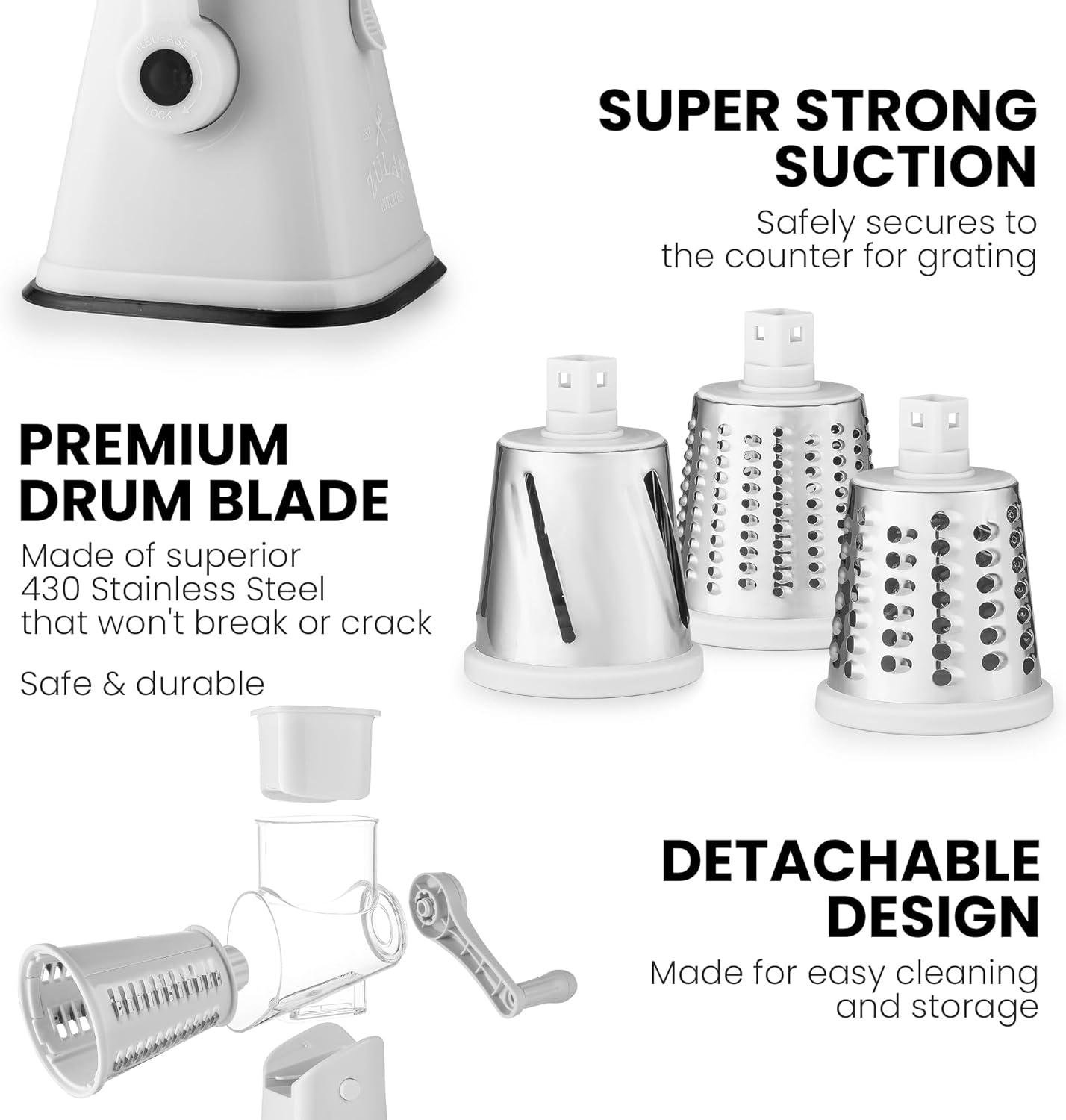 Zulay Kitchen Cheese Grater Hand Crank, Grater For Kitchen With Reinforced Suction – Rotary Cheese Grater With 3 Replaceable Stainless Steel Blades – Easy to Use & Clean – Vegetable Cutter – White(Blizzard White)