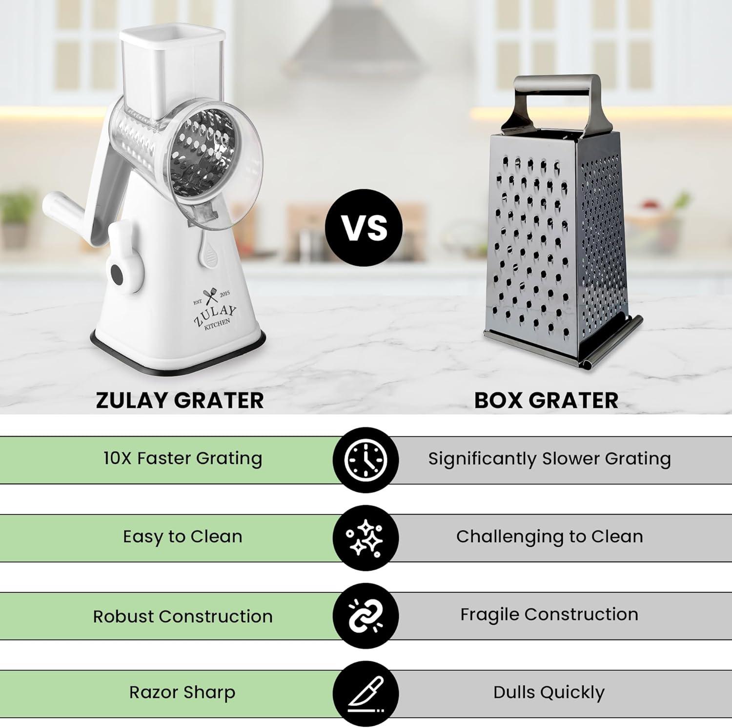 FUNCTIONAL AND STEADY OPERATION: The Zulay Cheese Grater with Handle comes with a powerful non-slip suction base that locks the grater in place to ensure a sturdy and secured operation. Ensures a fast and efficient grating experience, 18 times faster than ordinary cutting.